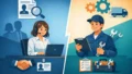作業服の人物を中央に、賃金の動きや仕事環境を象徴する要素が周囲に配置されたイラスト構図 雇用形態の違い・比較