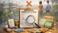 中央の書類を留めたクリップボードと虫眼鏡を主役に、手前に硬貨や封筒が置かれ奥に街並みが広がる構図 社会保険・税金