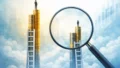 拡大鏡のある複数の書類束とクリップボードが、退職後に必要な書類整理の流れを示すイラスト 契約・精度の違い